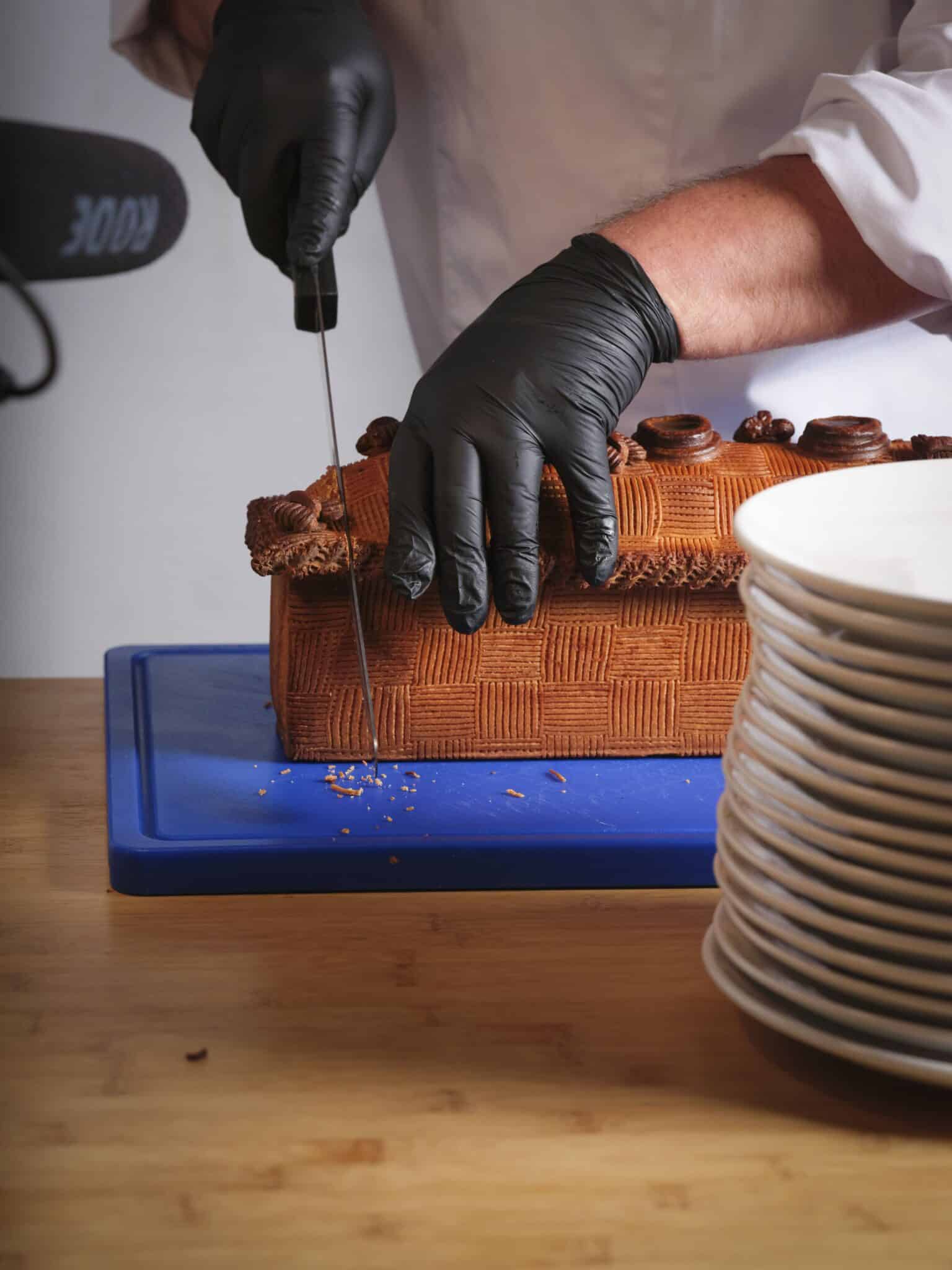 - La Découpe : Pas de timidité! « Trancher comme une bûche de Noël, de bout en bout ». Il est impératif d’avoir l’ensemble de la mosaïque (croûte, gelée, farces, marquants) dans chaque tranche pour découvrir « ce qui se cache à l’intérieur ».